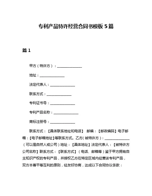 专利产品特许经营合同书5篇篇1专利产品特许经营合同书甲方(出让方):____________(单位名称或姓名)、注册地为___________,法定代表人为____________,联系地址为____________,联系电话为____________;乙方(受让方):____________(单位名称或姓名)、注册地为___________,法定代表人为____________,联系地址为____________,联系电话为____________;鉴于:甲方是具有____________(专利产品名称)专利权的权利人,拟将该专利产品权利转让给乙方,乙方申请获得该专利产品的特许经营权,为此,双方经友好协商,就相关事宜订立本合同。