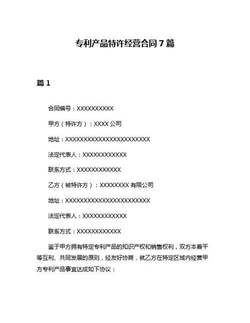 专利产品特许经营合同7篇篇1合同编号:XXXXXXXXXX甲方(特许方):XXXX公司地址:XXXXXXXXXXXXXXXXXXXXXXX法定代表人:XXXXXXXXXXXX联系方式:XXXXXXXXXXXX乙方(被特许方):XXXXXXXX有限公司地址:XXXXXXXXXXXXXXXXXXXXXXX法定代表人:XXXXXXXXXXXX联系方式:XXXXXXXXXXXX鉴于甲方拥有特定专利产品的知识产权和销售权利,双方本着平等互利、共同发展的原则,经友好协商,就乙方在特定区域内经营甲方专利产品事宜达成如下协议:第一条合同背景及目的本合同旨在明确甲乙双方就甲方专利产品在乙方指定区域范围内的特许经营关系。