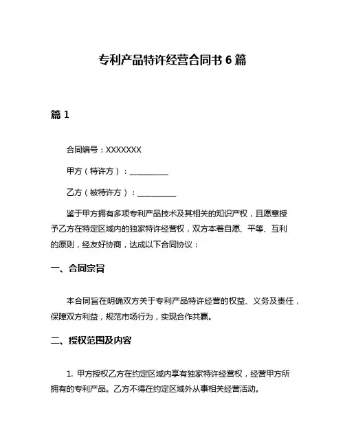 专利产品特许经营合同书6篇篇1合同编号:XXXXXXX甲方(特许方):___________乙方(被特许方):___________鉴于甲方拥有多项专利产品技术及其相关的知识产权,且愿意授予乙方在特定区域内的独家特许经营权,双方本着自愿、平等、互利的原则,经友好协商,达成以下合同协议:一、合同宗旨本合同旨在明确双方关于专利产品特许经营的权益、义务及责任,保障双方利益,规范市场行为,实现合作共赢。