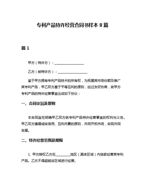 专利产品特许经营合同书样本8篇篇1甲方(特许方):____________________乙方(被特许方):____________________鉴于甲方拥有专利产品技术的所有权,为拓展其市场份额及推广其专利产品,甲乙双方基于平等互利的原则,经过友好协商,就甲方专利产品的特许经营事宜达成如下协议:一、合同宗旨及原则本合同旨在明确甲乙双方就专利产品特许经营事宜的权利与义务。