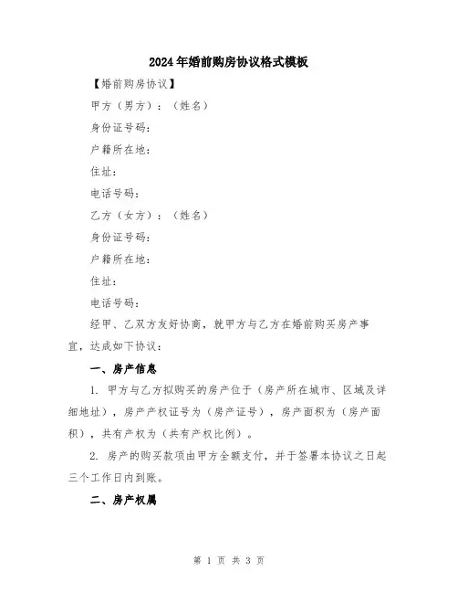 2024年婚前购房协议格式模板【婚前购房协议】甲方(男方):(姓名)身份证号码:户籍所在地:住址:电话号码:乙方(女方):(姓名)身份证号码:户籍所在地:住址:电话号码:经甲、乙双方友好协商,就甲方与乙方在婚前购买房产事宜,达成如下协议:一、房产信息1. 甲方与乙方拟购买的房产位于(房产所在城市、区域及详细地址),房产产权证号为(房产证号),房产面积为(房产面积),共有产权为(共有产权比例)。