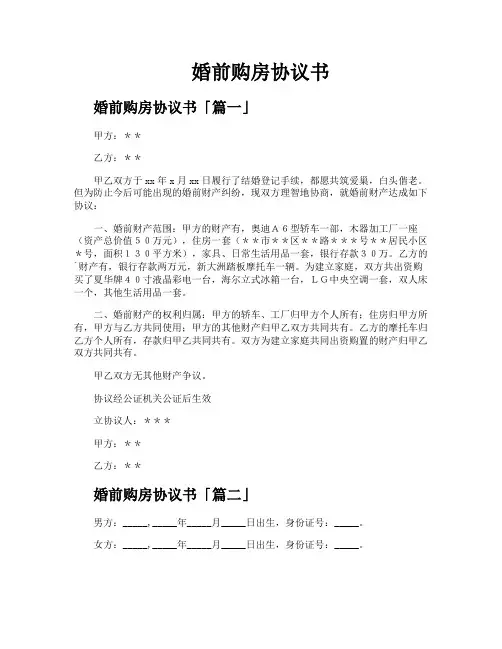婚前购房协议书5篇篇1甲方(购房人):____________________身份证号码:________________________联系方式:________________________乙方(购房人):____________________身份证号码:________________________联系方式:________________________鉴于甲、乙双方即将步入婚姻的殿堂,为了明确双方在婚前购房事宜上的权益与责任,根据《中华人民共和国合同法》及相关法律法规的规定,双方在平等、自愿、公平的原则基础上,经过充分协商,达成如下协议:一、购房基本情况双方共同购买位于__________________的房产,房屋面积为______平方米,购房总价为人民币______元整(大写)。