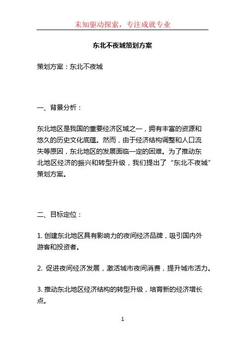 东北不夜城策划方案策划方案:东北不夜城一、背景分析:东北地区是我国的重要经济区域之一,拥有丰富的资源和悠久的历史文化底蕴。