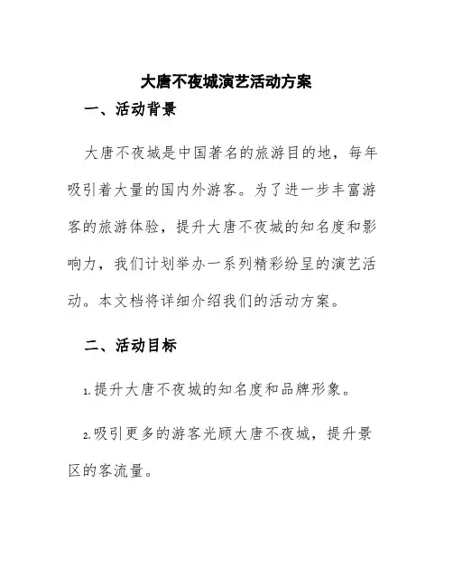 大唐不夜城演艺活动方案一、活动背景大唐不夜城是中国著名的旅游目的地,每年吸引着大量的国内外游客。