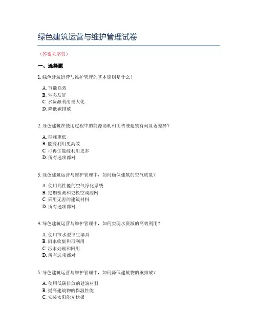 绿色建筑运营与维护管理试卷(答案见尾页)一、选择题1. 绿色建筑运营与维护管理的基本原则是什么?A. 节能高效B. 生态友好C. 水资源利用最大化D. 降低碳排放2. 绿色建筑在使用过程中的能源消耗相比传统建筑有何显著差异?A. 能耗更低B. 能源利用更高效C. 可再生能源利用更多D. 所有选项都对3. 绿色建筑运营与维护管理中,如何确保建筑的空气质量?A. 使用高性能的空气净化系统B. 定期检测和更换空调滤网C. 采用无害的建筑材料D. 所有选项都对4. 绿色建筑运营与维护管理中,如何实现水资源的高效利用?A. 使用节水型卫生器具B. 雨水收集和再利用C. 污水处理和回用D. 所有选项都对5. 绿色建筑运营与维护管理中,如何降低建筑物的碳排放?A. 使用低碳排放的建筑材料B. 提高建筑物的保温性能C. 安装太阳能光伏板D. 所有选项都对6. 绿色建筑在使用过程中的维护与修理如何实现环保?A. 采用可回收和可维修的材料B. 定期检查和维护设备设施C. 提供节能型设备和产品D. 所有选项都对7. 绿色建筑运营与维护管理中,如何提高建筑的可见性和舒适度?A. 优化建筑外观设计B. 提供充足的自然光照和视野C. 使用高性能的隔音和隔热材料D. 所有选项都对8. 绿色建筑在使用过程中的垃圾分类与回收如何实施?A. 设立专门的垃圾分类收集区B. 使用智能回收系统C. 提倡居民进行分类投放D. 所有选项都对9. 绿色建筑运营与维护管理中,如何评估建筑的可持续性?A. 制定详细的可持续性报告B. 定期进行环境影响评估C. 采用第三方认证机构进行评估D. 所有选项都对10. 绿色建筑运营与维护管理的未来发展趋势是什么?A. 更多的智能化和自动化技术应用B. 更加注重生物多样性和生态平衡C. 更加注重室内环境质量和健康保障D. 所有选项都对11. 绿色建筑运营与维护管理的基本原则是什么?A. 节能高效B. 生态友好C. 经济合理D. 社会可持续12. 绿色建筑在设计阶段需要考虑哪些因素以优化运营与维护?A. 建筑物的结构设计B. 建筑材料的选择C. 高效的能源系统D. 可持续的材料回收策略13. 绿色建筑运营与维护中,如何确保建筑的能源效率?A. 采用高效的设备和系统B. 定期进行设备检查和维修C. 优化建筑的能源管理系统D. 提高员工的节能意识14. 绿色建筑运营与维护中,如何减少建筑物的环境影响?A. 采用环保材料和设施B. 采用可持续的废物管理策略C. 减少建筑物的能源消耗D. 提高建筑物的可达性和舒适性15. 绿色建筑运营与维护中,如何提高建筑物的经济性?A. 采用低成本的运营和维护策略B. 通过节能措施降低能源费用C. 优化建筑物的维护和改造计划D. 提高建筑物的利用效率16. 绿色建筑运营与维护中,如何实现建筑物的社会可持续性?A. 提供公共空间和便利设施B. 促进社区参与和交流C. 保障建筑物的公平使用D. 提高建筑物的设计和建造质量17. 绿色建筑运营与维护中,如何进行建筑物的定期检查和维护?A. 制定详细的检查和维护计划B. 培训专业的维护团队C. 使用高质量的维护材料和工具D. 建立有效的沟通机制18. 绿色建筑运营与维护中,如何处理建筑物的废弃物?A. 首先分类收集废弃物B. 推广循环利用和减少废物产生C. 采用安全的废弃物处理方法D. 与周边社区合作建立废弃物处理系统19. 绿色建筑运营与维护中,如何提高建筑的灵活性和可适应性?A. 设计灵活的建筑空间B. 采用可拆卸和可重组的建筑构件C. 提供多功能的使用场景D. 采用先进的建筑技术和智能化系统20. 绿色建筑运营与维护中,如何评估建筑物的环境性能?A. 制定环境性能评估指标B. 定期进行环境性能监测和评价C. 采取必要的改进措施D. 与相关方共享评估结果21. 绿色建筑运营与维护管理的核心理念是什么?A. 节能高效B. 环境友好C. 生态平衡D. 社会和谐22. 绿色建筑在设计阶段需要考虑哪些因素以优化运营与维护?A. 节能技术B. 水资源管理C. 废弃物处理D. 绿化景观23. 绿色建筑运营与维护中,如何确保建筑物的长期稳定运行?A. 定期检查与维修B. 预防性维护C. 故障诊断与预警系统D. 运行数据监测分析24. 绿色建筑运营与维护中,如何实现能源的高效利用?A. 采用可再生能源B. 提高设备效率C. 优化运行策略D. 定期维护与升级25. 绿色建筑运营与维护中,如何降低建筑物的环境影响?A. 采用低碳技术B. 减少废弃物产生C. 合理利用水资源D. 增强绿化景观26. 绿色建筑运营与维护中,如何提高建筑物的经济效益?A. 提高能源效率B. 降低运营成本C. 增加附加值服务D. 提高建筑物利用率27. 绿色建筑运营与维护中,如何实现建筑物的社会效益?A. 提供绿色空间B. 促进社区交流C. 提高居民生活质量D. 增强建筑物的教育意义28. 绿色建筑运营与维护中,如何应对气候变化带来的挑战?A. 加强建筑物的隔热性能B. 使用低碳燃料C. 增强绿地生态系统D. 优化建筑物的能源系统29. 绿色建筑运营与维护中,如何提高建筑物的智能化水平?A. 引入智能家居系统B. 使用大数据分析C. 采用物联网技术D. 建立远程监控系统30. 绿色建筑运营与维护的未来发展趋势是什么?A. 智能化与自动化B. 绿色建材与再生利用C. 共享经济与可持续发展D. 生态城市与区域一体化31. 绿色建筑运营与维护管理的基本原则是什么?A. 节能高效B. 生态友好C. 经济合理D. 社会可持续32. 绿色建筑在设计阶段需要考虑的主要因素包括哪些?A. 节能与能源利用B. 水资源管理C. 废弃物管理与回收D. 室内环境质