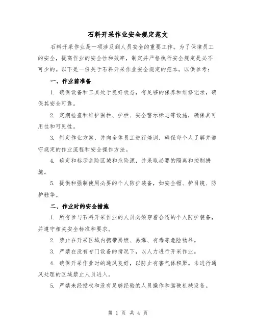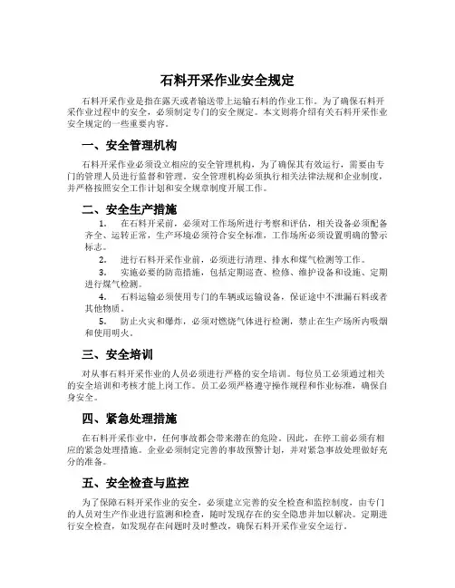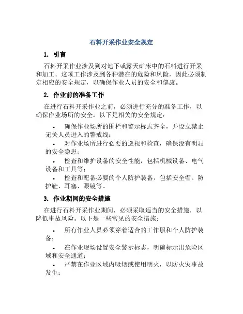 石料开采作业安全规定1. 引言石料开采作业涉及到对地下或露天矿床中的石料进行开采和加工。