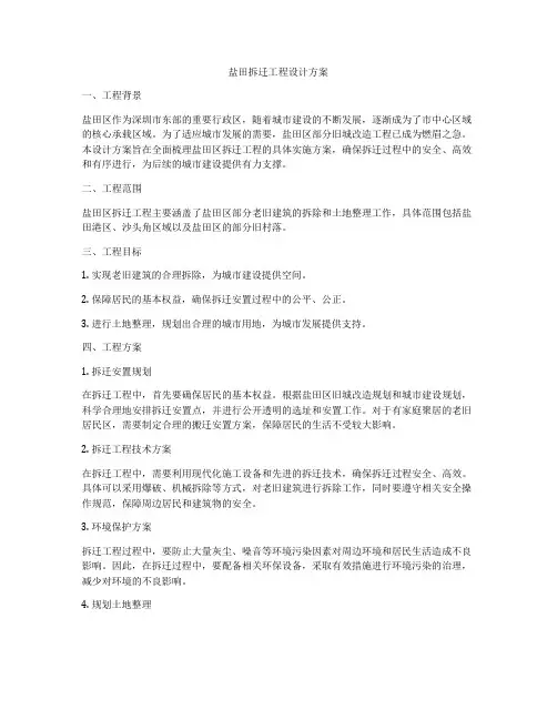 盐田拆迁工程设计方案一、工程背景盐田区作为深圳市东部的重要行政区,随着城市建设的不断发展,逐渐成为了市中心区域的核心承载区域。