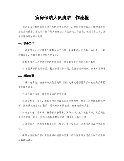 病房保洁人员清洁工作流程一、工作前的准备1. 着装准备病房保洁人员应穿戴整洁、干净的工作服,佩戴帽子和口罩,戴上一次性手套,确保个人卫生和防护。