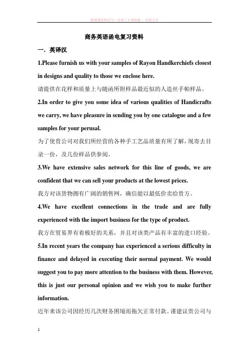 商务英语函电复习资料一.英译汉1.Please furnish us with your samples of Rayon Handkerchiefs closest in designs and quality to those we enclose here.请提供在花样和质量上与随函所附样品最近似的人造丝手帕样品。