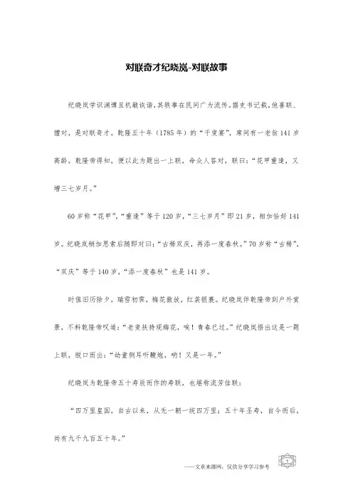 文档下载后可定制修改,请根据实际需要进行调整和使用,谢谢!并且,本店铺为大家提供各种类型的教育资料,如知识梳理、古诗鉴赏、阅读理解、计划总结、学习综合、试题大全、教案大全、作文大全、语文大全、其他资料等等,想了解不同资料格式和写法,敬请关注!Download tips: This document is carefully compiled by this editor.I hope that after you download it, it can help you solve practical problems. The document can be customized and modified after downloading, please adjust and use it according to actual needs, thank you!In addition, this store provides various types of educational materials for everyone, such as knowledge sorting, ancient poetry appreciation, reading comprehension, plan summary, learning synthesis, test questions, lesson plans, composition, Chinese, and other materials. Please pay attention to the data format and writing method!巧对对子故事12 纪晓岚妙对乾隆帝纪晓岚妙对乾隆帝一提起乾隆爷时代的风流才子,大家都耳濡目染,最熟悉不过,他就是那个铜牙铁齿,博古通今,能言善辩,嬉笑怒骂皆成文章的翰林编修纪晓岚。