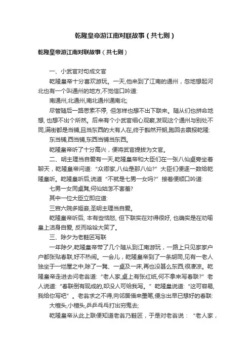 乾隆皇帝游江南对联故事(共七则)乾隆皇帝游江南对联故事(共七则)一、小武官对句成文官乾隆皇帝十分喜欢游玩。