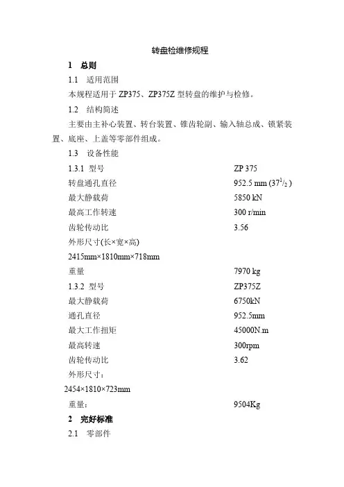 转盘检维修规程1 总则1.1 适用范围本规程适用于ZP375、ZP375Z型转盘的维护与检修。