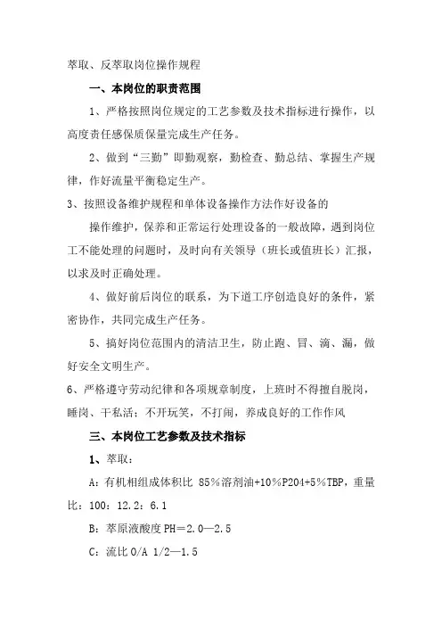 萃取、反萃取岗位操作规程一、本岗位的职责范围1、严格按照岗位规定的工艺参数及技术指标进行操作,以高度责任感保质保量完成生产任务。
