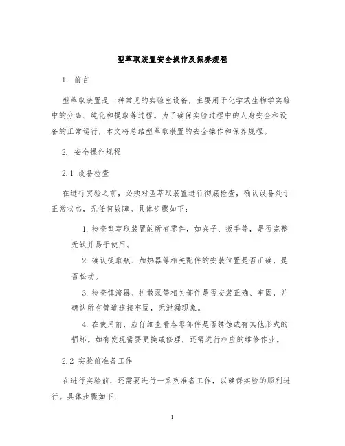 型萃取装置安全操作及保养规程1. 前言型萃取装置是一种常见的实验室设备,主要用于化学或生物学实验中的分离、纯化和提取等过程。