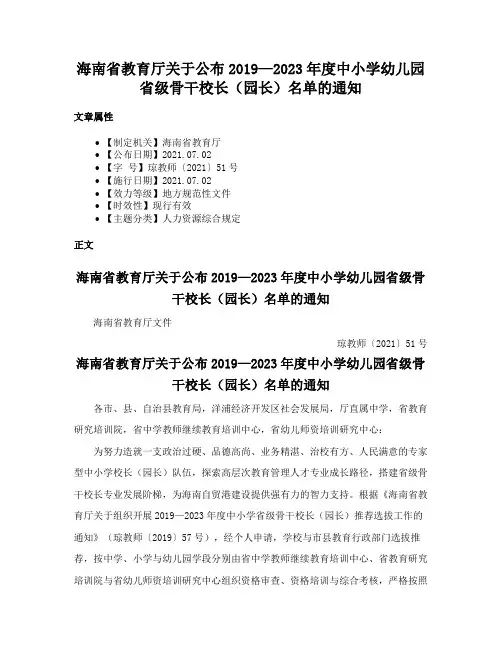 海南省教育厅关于公布2019—2023年度中小学幼儿园省级骨干校长(园长)名单的通知文章属性•【制定机关】海南省教育厅•【公布日期】2021.07.02•【字号】琼教师〔2021〕51号•【施行日期】2021.07.02•【效力等级】地方规范性文件•【时效性】现行有效•【主题分类】人力资源综合规定正文海南省教育厅关于公布2019—2023年度中小学幼儿园省级骨干校长(园长)名单的通知海南省教育厅文件琼教师〔2021〕51号海南省教育厅关于公布2019—2023年度中小学幼儿园省级骨干校长(园长)名单的通知各市、县、自治县教育局,洋浦经济开发区社会发展局,厅直属中学,省教育研究培训院,省中学教师继续教育培训中心,省幼儿师资培训研究中心:为努力造就一支政治过硬、品德高尚、业务精湛、治校有方、人民满意的专家型中小学校长(园长)队伍,探索高层次教育管理人才专业成长路径,搭建省级骨干校长专业发展阶梯,为海南自贸港建设提供强有力的智力支持。