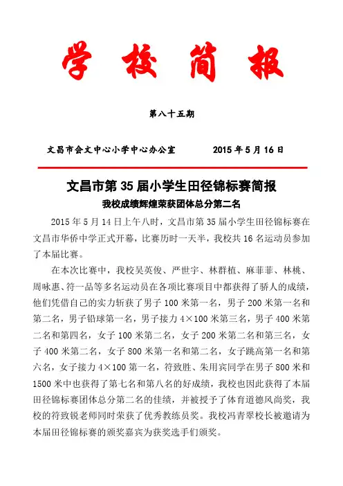学校简报第八十五期文昌市会文中心小学中心办公室 2015年5月16日文昌市第35届小学生田径锦标赛简报我校成绩辉煌荣获团体总分第二名2015年5月14日上午八时,文昌市第35届小学生田径锦标赛在文昌市华侨中学正式开幕,比赛历时一天半,我校共16名运动员参加了本届比赛。