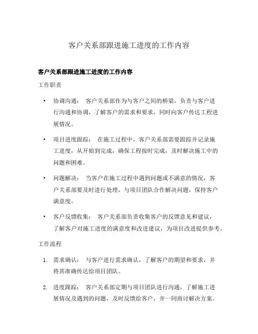 客户关系部跟进施工进度的工作内容客户关系部跟进施工进度的工作内容工作职责•协调沟通:客户关系部作为与客户之间的桥梁,负责与客户进行沟通和协调,了解客户的需求和要求,同时向客户传达工程进展情况。