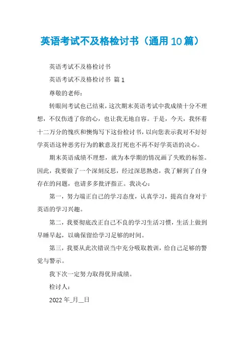 英语考试没考好检讨书优秀6篇英语考试没考好检讨书篇一尊敬的XXX:这次期中考试,我考的很差,对此在这检讨,希望以后不要再考这个分数。