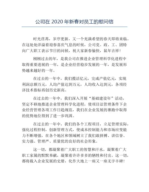 2020致职工家属春节慰问信2020致职工家属春节慰问信发布时间:2020-05-16新的20xx年,是公司确立新起点、实现新发展的关键一年。