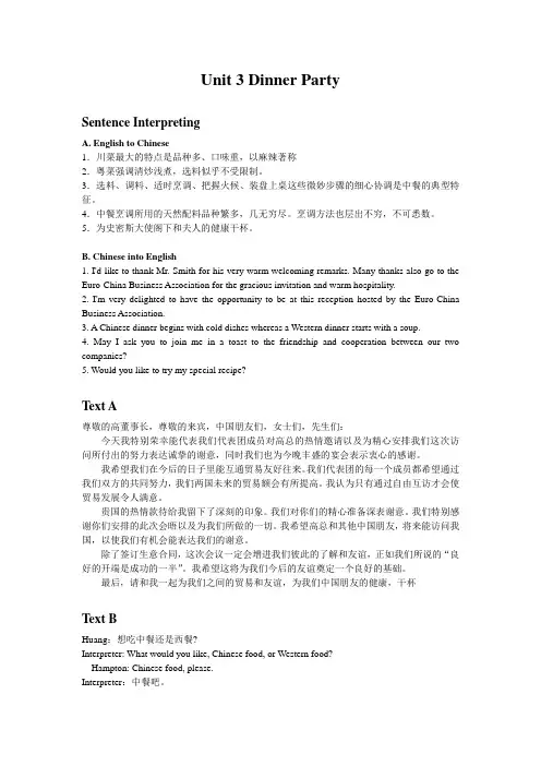 Unit 3 Dinner PartySentence InterpretingA. English to Chinese1.川菜最大的特点是品种多、口味重,以麻辣著称2.粤菜强调清炒浅煮,选料似乎不受限制。