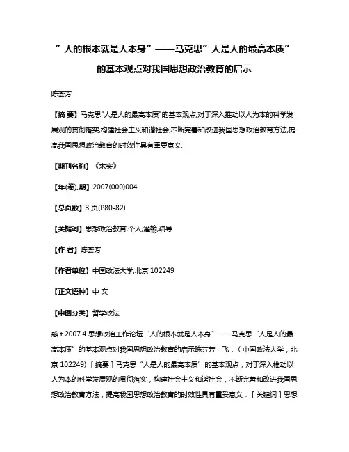 ”人的根本就是人本身”——马克思”人是人的最高本质”的基本观点对我国思想政治教育的启示陈荟芳【摘要】马克思"人是人的最高本质"的基本观点,对于深入推动以人为本的科学发展观的贯彻落实,构建社会主义和谐社会,不断完善和改进我国思想政治教育方法,提高我国思想政治教育的时效性具有重要意义.【期刊名称】《求实》【年(卷),期】2007(000)004【总页数】3页(P80-82)【关键词】思想政治教育;个人;灌输;疏导【作者】陈荟芳【作者单位】中国政法大学,北京,102249【正文语种】中文【中图分类】哲学政法惑 t 2007.4思想政治工作论坛‘人的根本就是人本身”一一马克思“人是人的最高本质”的基本观点对我国思想政治教育的启示陈芬芳-飞,(中国政法大学,北京 102249) [摘要]马克思“人是人的最高本质”的基本观点,对于深入椎动以人为本的科学发展观的贯彻落实,构建社会主义和谐社会,不断完善和改进我国思想政治教育方法,提高我国思想政治教育的时效性具有重妥意义.[关键词]思想政治教育;个人;灌输 g 疏导[中图分类号]四4 · [文献标i 只码] A[文章编号] 1007- 8487(2007)04一0080一03思想政治教育是人类社会的一种社会实践活动。