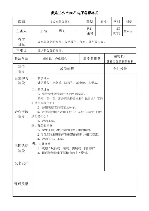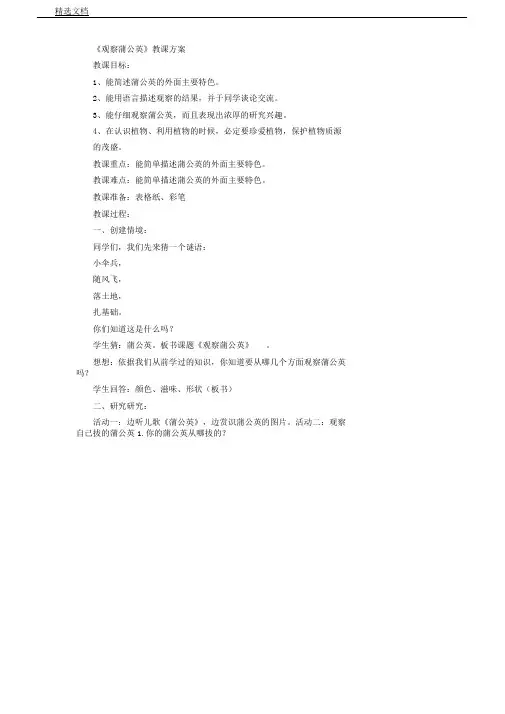 教学准备:教师准备:放大镜、蒲公英学生准备:科学学生活动手册、笔教学重点:1.能利用感官或借助工具观察蒲公英的特征。