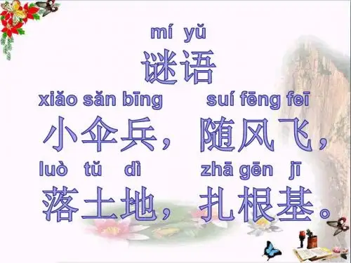 教课准备:表格纸、彩笔教课过程:一、创建情境:同学们,我们先来猜一个谜语:小伞兵,随风飞,落土地,扎基础。