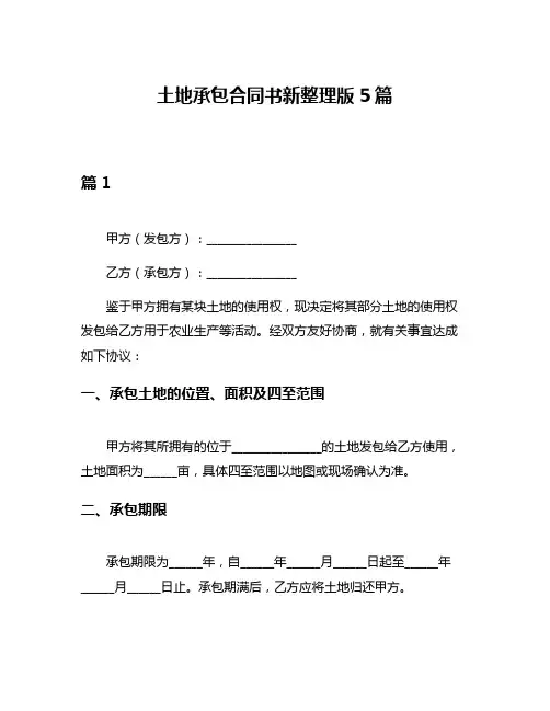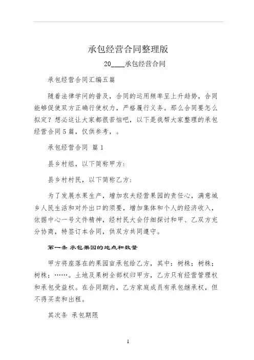企业承包经营合同新整理版6篇篇1甲方(发包方):__________乙方(承包方):__________鉴于甲方拟将其经营的企业发包给乙方进行经营,乙方愿意接受甲方的发包并承担经营风险,双方经过友好协商,达成如下协议:一、合同背景及目的本合同旨在明确甲、乙双方在承包经营过程中的权利与义务,确保双方共同遵守并执行。