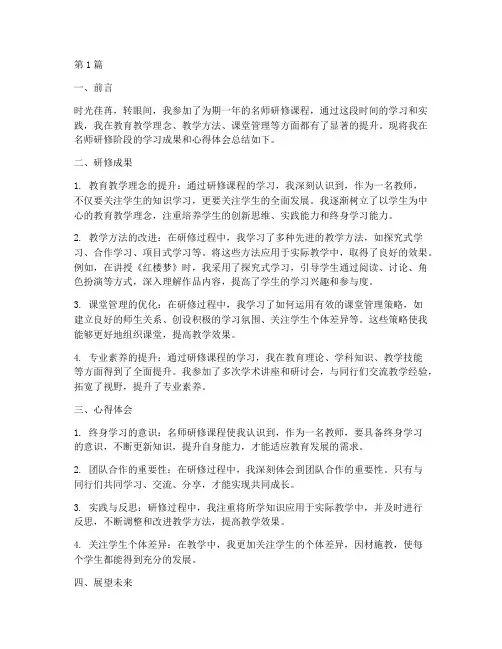 第1篇一、前言时光荏苒,转眼间,我参加了为期一年的名师研修课程,通过这段时间的学习和实践,我在教育教学理念、教学方法、课堂管理等方面都有了显著的提升。