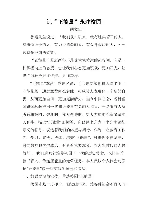 让“正能量”永驻校园胡文忠鲁迅先生说过:“我们从古以来,就有埋头苦干的人,有拼命硬干的人,有为民请命的人,有舍身求法的人,……这就是中国的脊梁。