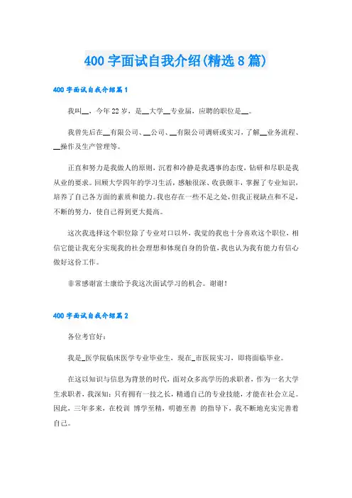 文档下载后可定制修改,请根据实际需要进行调整和使用,谢谢!并且,本店铺为大家提供各种类型的实用范文,如学习资料、英语资料、学生作文、教学资源、求职资料、创业资料、工作范文、条据文书、合同协议、其他范文等等,想了解不同范文格式和写法,敬请关注!Download tips: This document is carefully compiled by this editor. I hope that after you download it, it can help you solve practical problems. The document can be customized and modified after downloading, please adjust and use it according to actual needs, thank you!In addition, this shop provides various types of practical sample essays, such as learning materials, English materials, student essays, teaching resources, job search materials, entrepreneurial materials, work examples, documents, contracts, agreements, other essays, etc. Please pay attention to the different formats and writing methods of the model essay!大学生面试自我介绍400字7篇大学生面试自我介绍400字最新7篇参加招聘面试的时候,求职者第一件事就是做自我介绍,作为应届毕业的大学生求职者,你会怎么做自我介绍呢?下面是本店铺为大家整理的关于大学生面试自我介绍400字,希望对您有所帮助!大学生面试自我介绍400字(精选篇1)各位领导好!很荣幸有这样一个机会,让本人向各位做自我介绍。