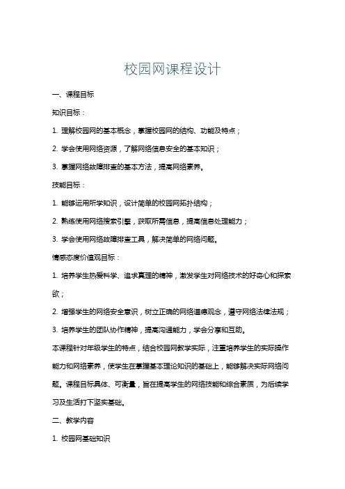 校园网课程设计一、课程目标知识目标:1. 理解校园网的基本概念,掌握网络的结构、组成及功能;2. 学会使用网络搜索引擎,获取所需的学习资源;3. 了解网络安全知识,提高网络安全意识。