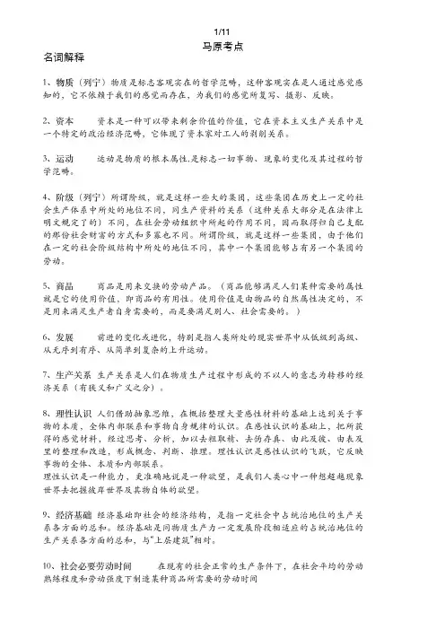 ⻢原考点名词解释1、物质(列宁)物质是标志客观实在的哲学范畴,这种客观实在是⼈通过感觉感知的,它不依赖于我们的感觉⽽存在,为我们的感觉所复写、摄影、反映。