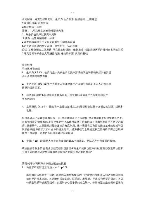 政治经济学剩余价值:剩余价值是指剥削劳动者所生产的新价值中的利润(劳动创造的价值和工资之间的差异),即"劳动者创造的被资产阶级无偿占有的劳动"简答:对于名词解释当中相应概念的拓展1.马克思唯物辩证法内涵(p45-p55):唯物辩证法作为关于自然、社会和人类思维发展的一般规律的科学,是人们认识世界和改造世界的根本方法。