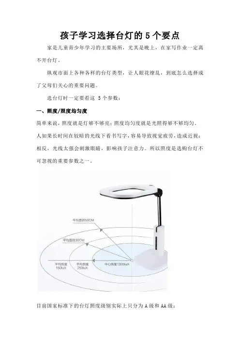 三、正确使用台灯的方法1.保持距离:台灯的位置应当与孩子的视线保持一定的距离,一般来说,离书桌的距离应该在30cm以上。