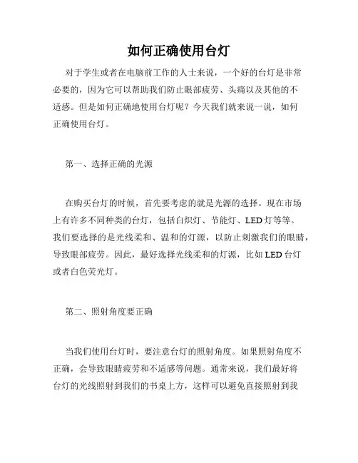 如何正确使用台灯对于学生或者在电脑前工作的人士来说,一个好的台灯是非常必要的,因为它可以帮助我们防止眼部疲劳、头痛以及其他的不适感。