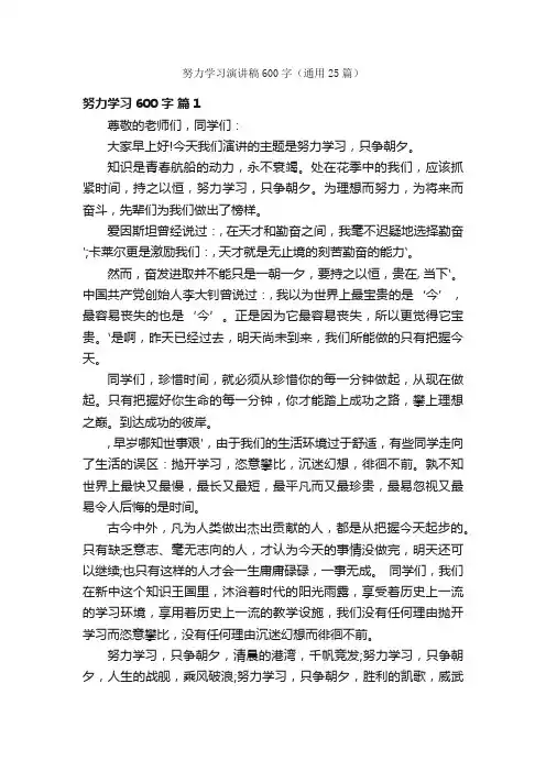 努力学习演讲稿600字(通用25篇)努力学习600字篇1尊敬的老师们,同学们:大家早上好!今天我们演讲的主题是努力学习,只争朝夕。