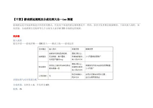 【干货】游戏联运规则及分成比例大全—ios渠道游戏联运是开发商和渠道合作的常见模式,但是各个渠道的联运规则都是不一样的,很多开发者都会被搞糊涂,下面从接入流程,如何评级,分成政策以及税率等几个方面为大家详解IOS市场联运的规则。