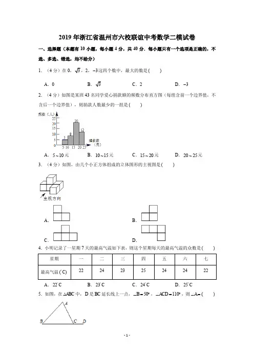 2019年浙江省温州市六校联谊中考数学二模试卷一、选择题(本题有10小题,每小题4分,共40分.每小题只有一个选项是正确的,不选、多选、错选,均不给分)1.(4分)在02,3-这四个数中,最大的数是( )A .0B C .2D .3-2.(4分)如图是某班43名同学爱心捐款额的频数分布直方图(每组含前一个边界值,不含后一个边界值),则捐款人数最少的一组是( )A .5~10元B .10~15元C .15~20元D .20~25元3.(4分)如图,由几个小正方体组成的立体图形的主视图是( )A .B .C .D .4.小明记录了一星期7天的最高气温如下表,则这个星期每天的最高气温的众数是( )A .22C ︒B .23C ︒C .24C ︒D .25C ︒5.如图,在ABC ∆中,D 是BC 延长线上一点,50B ∠=︒,110ACD ∠=︒,则(A ∠= )A .50︒B .60︒C .70︒D .80︒6.(4分)如图,在Rt ABC ∆中,90C ∠=︒,5AB =,4AC =,则cos B 的值是( )A .34B .35C D .457.(4分)不等式2(1)x x -…的解集在数轴上表示为( ) A .B .C .D .8.(4分)若分式242x x -+的值为0,则x 的值为( )A .2±B .2C .2-D .09.(4分)如图,已知点A ,B 分别在反比例函数4(0)y x x =>,9(0)y x x=->的图象上,且OA OB ⊥,则OBOA的值为( )A .32B .49C .23D .9410.(4分)如图,四边形ABCD 中,//AD BC ,点M 是AD 的中点,若动点N 从点B 出发沿边BC 方向向终点C 运动,连结BM ,CM ,AN ,DN ,则在整个运动过程中,阴影部分面积和的大小变化情况是( )A .不变B .一直变大C .先减小后增大D .先增大后减小二、填空题(本题有6题,每小题5分,共30分) 11.(5分)分解因式:25m m += .12.(5分)某次考试A ,B ,C ,D ,E 这5名学生的平均分为64分,若学生A 除外,其余学生的平均得分为61分,则学生A 的得分为 .13.(5分)若圆锥地面的半径为3,它的侧面展开图的面积为为16π,则它的母线长为 . 14.(5分)如图,将ABC ∆沿BC 方向平移4cm 得到DEF ∆,如果四边形ABFD 的周长是28cm ,则DEF ∆的周长是 cm .15.(5分)如图,正方形ABCD 的边长是3,点E ,F 分别是AB ,BC 边上的点,且满足2BE AE =,2CF BF =,连结DE ,AF 交于点G ,BD 交AF 于点H ,则四边形GEBH 的面积为 .16.(5分)小林用宽为18cm 的卡纸ABCD 制作五折式贺卡:左右折叠使AD 与BC 重合,展开后得图1所示折痕;将折痕右侧沿EF 折叠使BC 与图1的折痕重叠,得图2所示长方形B EFC '';翻折AD 至A D '',使点A ',D '分别落在线段B E ',C F '上,得图3,再分别沿C M ',B N '折叠使得D ',A '落在C B ''上分别记为P ,Q .K 是PM 延长线与EF 的交点,且H ,Q ,K 三点共线,5PM cm =,则卡纸ABCD 的周长 cm .三、解答题(本题有8小题,共80分,解答需写出必要的文字说明、演算步骤或证明过程)17.(10分)(1)计算:0(2019)sin 45-+︒.(2)化简:2()(3)a b b b a -++.18.(10分)一个不透明的布袋里装有3个球,其中2个红球,1个白球,它们除颜色外其余都相同.(1)求从布袋中摸出一个球是白球的概率.(2)摸出1个球,记下颜色后放回,并搅匀,再摸出1个球,求两次摸出的球恰好颜色相同的概率(要求画树状图或列表).19.(8分)“一路一带”倡议6岁了!到目前为止,中国已与126个国家和29个国际组织签署174份合作文件,共建“一路一带”国家已由亚欧延伸至非洲、拉美、南太等区域.截止2019年一季度末,人民币海外基金业务规模约3000亿元,其投资范围覆盖交通运输、电力能源、金融业和制造业等重要行业,投资行业统计图如图所示.(1)求投资制造业的基金约为多少亿元?(2)按照规划,中国将继续对“一路一带”基金增加投入,到2019年三季度末,共增加投入630亿元,假设平均每季度的增长率相等,求平均每季度的增长率是多少?20.(8分)如图,在所给的88网格中,每个小正方形的边长都为1,按下列要求画四边形,使它的四个顶点都在方格的顶点上.(1)在图甲中画出周长为18的四边形;(2)在图乙中画出一个是中心对称图形,但不是轴对称图形,且周长为18的四边形.(注:图甲、乙在答题纸上)21.(10分)如图,已知平行四边形ABCD ,过点A ,C ,D 的O 交直线BC 点F ,连结AF ,DF ,点A 是FD 的中点. (1)求证:四边形ABCD 是菱形. (2)若6AB =,且2sin 5AFD ∠=,求O 的半径.22.(10分)如图,抛物线24y ax bx =-+与坐标轴分别交于A ,B ,C 三点,其中(3,0)A -,(8,0)B ,点D 在x 在轴上,AC CD =,过点D 作DE x ⊥轴交抛物线于点E ,点P ,Q 分别是线段CO ,CD 上的动点,且CP QD =. (1)求抛物线的解析式.(2)记APC ∆的面积为1S ,PCQ ∆的面积为2S ,QED ∆的面积为3S ,若1324S S S +=,求出Q 点坐标.(3)连结AQ ,则AP AQ +的最小值为 .(请直接写出答案)23.(10分)如图,在平面直角坐标系中,点(1,2)A ,(5,0)B ,抛物线22(0)y ax ax a =->交x 轴正半轴于点C ,连结AO ,AB . (1)求点C 的坐标和直线AB 的表达式.(2)设抛物线22(0)y ax ax a =->分别交边BA ,BA 延长线于点D ,E . ①若3AE AO =,求抛物线表达式.②若CDB∆相似,则a的值为.(请直接写出答案)∆与BOA24.(14分)以“绿色生活,美丽家园”为主题的“2019北京世园会”在2019年4月29日在北京开幕,花团锦簇,颇为壮观.北京某展区计划展出150000株花如图所示,现承包给甲、乙两队进行实地造型摆放.已知甲队摆放42000株时所用的时间比乙队摆放9000株多用2天时间,甲队每天摆放的株数是乙队每天摆放株数的2倍.(1)甲、乙两队每天分别摆放多少株?(2)若甲队每人每天平均摆放600株,乙队每人每天平均摆放400株,因工作需要,甲、乙两队分别被调离a,b人后,每人每天摆放的株数需要提高20%,才能使两队每天的摆放的株数总和不变.若甲队多调离4人后每天所摆放总株数比乙队少调离1人后的每天所摆放的总株数还多5000株(按照原来每天摆放速度),求a,b的值.(3)若甲队每天所需费用为3000元,乙队每天所需费用为2000天,且乙队总费用不超过甲队总费用.该工程