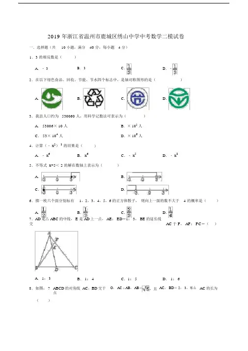 最新2019届浙江省温州市鹿城区中考数学二模试卷((有答案))