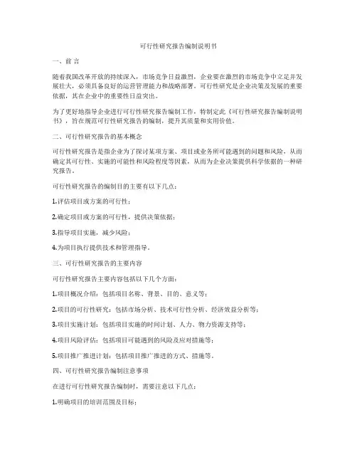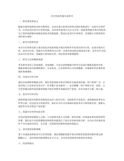 可行性研究报告说明书一、研究背景和意义随着市场环境和技术的不断变化,企业在进行新项目投资决策时需要进行一定的可行性研究,以评估项目的可行性和风险。
