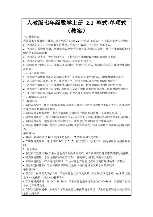 2.1 整式(单项式)-人教版七年级数学上册导学案1. 学习目标•了解整式的概念和特点;•理解单项式的定义和简化方法;•能够根据给定的单项式进行化简和展开。