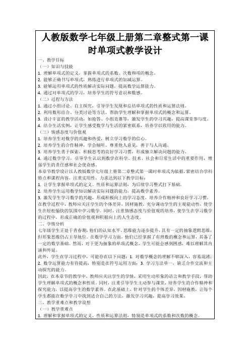 3、教学重难点:重点:单项式及其相关的概念难点:对单项式的系数、次数概念的理解与应用二、学情分析本节课是研究整式的开始,知识由数向式转化,由具体到抽象,从特殊到一般,与学生的认知基础和思维能力有一定差距,学习中会有一定困难。