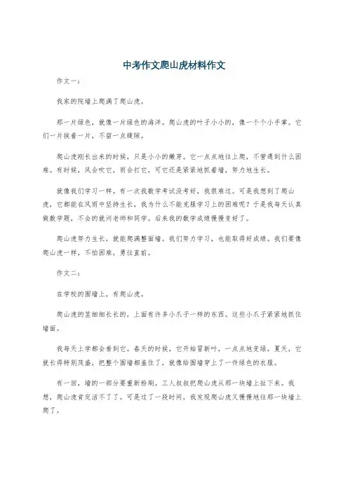 爬山虎作文(一):爬山虎爬山虎是虎吗不,它不是凶猛的虎,而是一种极普通的藤本植物.在房屋的墙上面,房顶上,在花园的栅栏上,篱笆上,爬着一种绿色的植物,这就是爬山虎.别看它很平凡,可浑身是宝,到处都有美丽的亮点.爬山虎不如它的名字那样威武,它没有牢固的根基,它的干和枝干差不多粗细.但是,它奋发有力,坚强不屈,无数只脚攀助墙壁,在你没有注意的时候,又迈出了一步,努力向上攀登,它柔软而强劲的身体里,显露的坚强毅力和无限生机,使人望之油然而生敬意.爬山虎没有牡丹那样华贵,没有玫瑰那样娇艳.也许你要说它不美,但它却给人以力量,促使人们努力奋进,每当我在学习中遇到困难,正想偷懒时,一想到爬山虎那种奋发向上的精神和坚强不屈的意志,就感到羞愧,这时,我就会立即振奋起来,鼓起勇气来战胜所有的困难.[由整理]爬山虎那种奋发向上的精神,实在是令人敬佩的,你看它,不管刮风下雨,墙面多滑,他总是一步一步向上长,直到墙顶,俯瞰大地,它生长速度较慢,不如雨后的春笋,但是,过不了几天你会突然发现,它又长高了,纤细的身影,努力向上,漫成一片.每当你看到这种绿色植物,难道你觉得它只是一种植物难道你就不想到它的质朴,坚强.难道你竟一点也联想不到在四化建设的道路上,处处有坚强不屈,就像这爬山虎一样奋发向上的英雄难道你又不更远一点想到,这样靠近团结,力求上进的爬山虎,宛然象征了这天在中华大地上勇敢拼搏,纵横决荡,用血和汗谱写新中国光辉篇章的民族精神和意志.爬山虎虽然不是真正的虎,却有着如同虎一般的力量,我要高声赞美爬山虎.爬山虎作文(二):爬山虎这天,我在我家后院墙上发现了一丛植物――“爬山虎”。