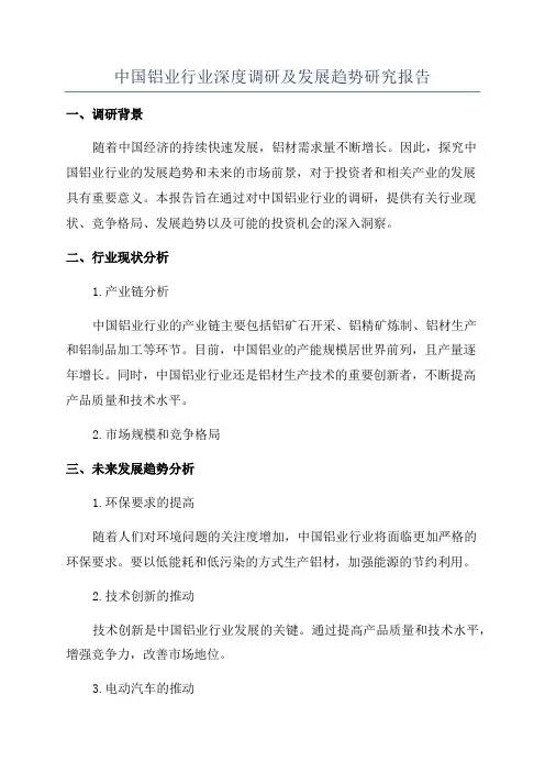 中国铝业行业深度调研及发展趋势研究报告一、调研背景随着中国经济的持续快速发展,铝材需求量不断增长。