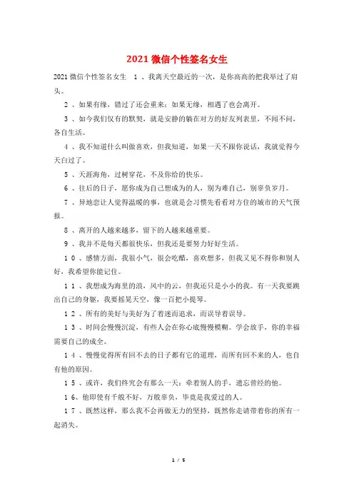 2021微信个性签名女生2021微信个性签名女生 1 、我离天空最近的一次,是你高高的把我举过了肩头。