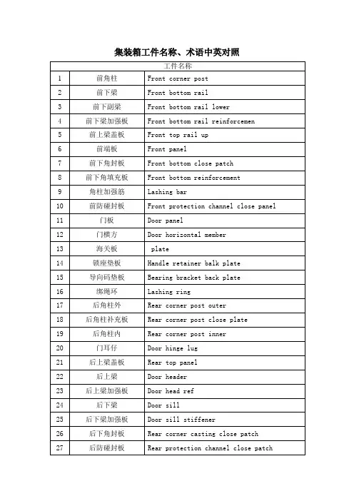 集装箱零件中英文对照后端Rear end assembly后角柱Rear corner post门楣板Door header plate后顶加强板Roof corner gusset门楣加强板Door header web门楣Door header lower门封压条Gasket retainer门板Door panel门横梁Door rail门槛Door sill门槛加强板Door sill web门竖梁Door frame hollow section门竖梁封板Door frame cover plate门搭扣Door keeper门端防撞槽封板Cover plate门端防撞槽Channel section小托架钢垫Steel gasket锁牌钢垫Steel gasket门楣梁Door header门搭扣挡铁Keeper restrict blockABS门封压条Gasket retainer大托架胶垫Shim弹垫Spring washer角件Corner fitting铰链销Hinge pin螺母Hut螺栓Bolt铆钉Rivet门端拉筋Lashing rod门端用哈克钉Huck-bolt门耳朵Hinge butt门封胶条Door gasket门铰链Hinge门绳Door holder内角柱Rear corner post inner锁杆Locking device锁牌胶垫Shim小托架胶垫Shim侧板Side wall assembly四波板Side panel二波侧板Side panel (small)有孔四波板Side panel (hole)顶侧梁Top side rail衣架角钢Garment angle有孔三波板Side panel (hole)三波板Side panel通风器V entilator通风器用HUCK钉Huck-bolt绳钩Lashing ring衣架角钢Garment angle assembly顶板Roof assembly商标Marking arrangement商标Trademark铭牌Consolidated plate铭牌胶垫Shim铆钉Rivet底架Base assembly短宽底横梁Wide outrigger鹅颈槽板Tunnel plate鹅颈槽背梁Tunnel bow短底横梁Outrigger鹅颈槽主梁Tunnel bolster鹅主梁地板角钢Floor support angle宽边底横梁Wide cross member底横梁Cross member地板中梁Floor center rail地板角钢Floor support angle底侧梁Bottom side rail宽底横梁加强板Wide cross member web 鹅颈槽顶板Tunnel plate鹅颈槽侧梁Tunnel side rail叉槽侧梁Fork pocket side rail叉槽底板Fork pocket bottom plate叉槽顶板Fork pocket top plate叉槽补强板Fork pocket support plate门端底横梁First cross member鹅颈槽主梁加强板Tunnel bolster gusset 底横梁加强板Cross member web底侧梁封板Rear end cover plate叉槽地板支撑角钢Floor support angle 叉槽Pork pocket plate自攻螺钉Self-tapping screw塑料地板角钢Floor support angle绳钩Lashing ring木地板Floor assembly门钩Door hook胶塞Rubber block前端Front end assembly前顶加强板Roof corner gusset前端楣板Front header plate前端上梁Front header lower前端防撞槽Channel section前角柱Front corner post前端防撞槽支撑封板Cover plate前墙板Front panel前端底下梁Front sill lower前端地板支撑Front support20’前端下梁Front sill前端下梁加强板Front sill web鹅颈槽封板Gooseneck tunnel gusset前端楣板梁Front header地板垫板Floor support plate楣板梁加强板Reinforcement plate前端底上梁Front sill upper前端加强角柱Front corner post reinforcement 角加强件Corner gusset前端地板支撑(PVC) Front floor support前端拉筋Lashing rod绳环Lashing ring。