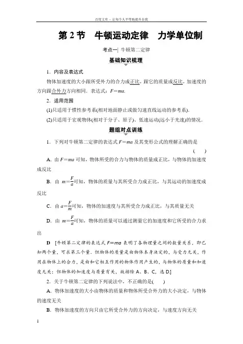 第2节牛顿运动定律力学单位制考点一| 牛顿第二定律1.内容及表达式物体加速度的大小跟所受外力的合力成正比,跟它的质量成反比,加速度的方向跟合外力方向相同.表达式:F=ma.2.适用范围(1)只适用于惯性参考系(相对地面静止或做匀速直线运动的参考系).(2)只适用于宏观物体(相对于分子、原子)、低速运动(远小于光速)的情况.1.下列对牛顿第二定律的表达式F=ma及其变形公式的理解正确的是() A.由F=ma可知,物体所受的合力与物体的质量成正比,与物体的加速度成反比B.由m=Fa可知,物体的质量与其所受合力成正比,与其运动的加速度成反比C.由a=Fm可知,物体的加速度与其所受合力成正比,与其质量无关D.由m=Fa可知,物体的质量可以通过测量它的加速度和它所受的合力求出D[牛顿第二定律的表达式F=ma表明了各物理量之间的数量关系,即已知两个量,可求第三个量.但物体的质量是由物体本身决定的,与受力无关,作用在物体上的合力,是由和它相互作用的物体作用产生的,与物体的质量和加速度无关;但物体的加速度与质量有关,故排除A、B、C,选D.]2.关于牛顿第二定律的下列说法中,不正确的是()A.物体加速度的大小由物体的质量和物体所受合外力的大小决定,与物体的速度无关B.物体加速度的方向只由它所受合外力的方向决定,与速度方向无关C.物体所受合外力的方向和加速度的方向及速度方向总是相同的D.一旦物体所受合外力为零,则物体的加速度立即为零,其运动速度将不再变化【解析】对于某个物体,合外力的大小决定了加速度的大小,合外力的方向决定了加速度的方向,而速度的方向与加速度方向无关.根据牛顿第二定律的瞬时性特征,合外力一旦为零,加速度立即为零,则速度不再发生变化,以后以此时的速度做匀速直线运动,综上所述,A、B、D正确,C错误.【答案】 C3.如图3-2-1所示,质量为1 kg的物体与桌面的动摩擦因数为,物体在7 N 的水平拉力作用下获得的加速度大小为(g取10 m/s2)()【导学号:】图3-2-1A.0B.5 m/s2C.8 m/s2D.12 m/s2B[物体所受合外力F合=F-μmg=5 N,加速度a=F合m=5 m/s2,选项B正确.]4.(2017·兰溪模拟)人站在地面,竖直向上提起质量为1 kg的物体,物体获得的加速度为5 m/s2(g取10 m/s2).则此过程中人对物体的作用力为() A.5 N B.10 NC.15 N D.20 NC[根据牛顿第二定律,物体竖直方向上有F-mg=ma,求得F=15 N.故选C.]考点二| 力学单位制1.力学中的基本物理量及单位(1)力学中的基本物理量是长度、质量、时间.(2)力学中的基本单位:基本物理量的所有单位都是基本单位.如:毫米(mm)、克(g)、毫秒(ms)等等.三个基本物理量的单位在国际单位制中分别为米(m)、千克(kg)、秒(s).2.单位制(1)由基本单位和导出单位组成的单位系统叫做单位制.(2)国际单位制(SI):国际计量大会制定的国际通用的、包括一切计量领域的单位制,叫做国际单位制.3.单位制的应用问题中的已知量的单位都用国际单位制表示时,计算的结果也是用国际单位制表示的.因此,用国际单位制进行计算时,可以不必一一写出各个已知量的单位,只在数字后面写出正确的单位就可以了.高中阶段进行物理量的计算时,一律采用国际单位制.在进行计算或检查的过程中,如果发现所求结果的单位与采用的单位制中该量的单位不一致,那么该公式或计算结果肯定是错误的.(2015·浙江10月学考)kg和s是国际单位制两个基本单位的符号,这两个基本单位对应的物理量是()A.质量和时间B.质量和位移C.重力和时间D.重力和位移A[kg是质量对应的单位,s是时间对应的单位,位移的单位是m,重力的单位是N且不是国际单位制基本单位,故A正确.](2016·浙江10月学考)下列均属于国际制基本单位的是() A.m、N、J B.m、kg、JC.m、kg、s D.kg、m/s、NC[7个国际单位:米、千克、秒、安培、开尔文、摩尔和坎德拉.故选C.]1.下列叙述中正确的是()A.在力学的国际单位制中,力的单位、质量的单位、位移的单位选定为基本单位B.牛顿、千克、米/秒2、焦、米都属于力的单位C.在厘米、克、秒单位制中,重力加速度g的值等于厘米/秒2D.在力学的计算中,若涉及的物理量都采用国际单位制中的单位,则所计算的物理量的单位也是国际单位制中的单位D[力的单位不是基本单位,焦、米不是力的单位,厘米、克、秒单位制中,重力加速度的值不是厘米/秒2而是980厘米/秒2,A、B、C错误;D正确.] 2.在国际单位制中规定“质量”为力学基本物理量,它对应的单位名称是() A.米B.千克C.秒D.牛顿【答案】B3.关于物理量和物理量的单位,下列说法中正确的是()【导学号:】A.在力学范围内,国际单位制规定长度、质量、力为三个基本物理量B.后人为了纪念牛顿,把“牛顿”作为力学中的基本单位C.1 N=1 kg·m·s-2D.“秒”“克”“摄氏度”都属于国际单位制中的单位C[力学中的三个基本物理量为长度、质量、时间,选项A错误;“牛顿”是为了纪念牛顿而作为力的单位,但不是基本单位,选项B错误;根据“牛顿”的定义,1 N=1 kg·m·s-2,选项C正确;“克”“摄氏度”不是国际单位制中的单位,选项D错误.]4.在国际单位制中,与质量、长度和时间对应的基本单位是()A.克、米、秒B.千克、米、小时C.克、厘米、分钟D.千克、米、秒D[在国际单位制中选定七个基本单位,其中力学有三个基本单位,即质量、长度和时间对应的单位,它们的单位分别是千克(kg)、米(m)、秒(s).D选项正确.]5.国际单位制由基本单位和导出单位组成.下列物理单位属于基本单位的