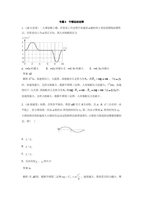 2. (2016江苏单科,9) (多选) 如图所示,一只猫在桌边猛地将桌布从鱼缸下拉出,鱼缸最终没有滑出桌面,若鱼缸、桌布、桌面两两之间的动摩擦因数均相等,则在上述过程中( )A .桌布对鱼缸摩擦力的方向向左B .鱼缸在桌布上的滑动时间和在桌面上的相等C .若猫增大拉力,鱼缸受到的摩擦力将增大D .若猫减小拉力,鱼缸有可能滑出桌面【答案】BD3.(2015海南单科,8) (多选) 如图,物块a 、b 和c 的质量相同,a 和b ,b 和c 之间用完全相同的轻弹簧S 1和S 2相连,通过系在a 上的细线悬挂于固定点O ,整个系统处于静止状态.现将细线剪断.将物块a 的加速度的大小记为a 1,S 1和S 2相对于原长的伸长分别记为Δl 1和Δl 2,重力加速度大小为g .在剪断的瞬间( )A .a 1=3gB .a 1=0C .Δl 1=2Δl 2D .Δl 1=Δl 2【答案】AC3.(2015新课标全国Ⅰ,20)(多选)如图(a),一物块在t =0时刻滑上一固定斜面,其运动的v-t 图线如图(b)所示.若重力加速度及图中的v 0、v 1、t 1均为已知量,则可求出( )A .斜面的倾角B .物块的质量C .物块与斜面间的动摩擦因数D .物块沿斜面向上滑行的最大高度【答案】ACD【解析】由v-t 图象可求知物块沿斜面向上滑行时的加速度大小为a =,根据牛顿v 0t 1第二定律得mg sin θ+μmg cos θ=ma ,即g sin θ+μg cos θ=.同理向下滑行时v 0t 1g sin θ-μg cos θ=,两式联立得sin θ=,μ=.可见能计算出v 1t 1v 0+v 12gt 1v 0-v 12gt 1cos θ斜面的倾斜角度θ以及动摩擦因数,选项A 、C 正确;物块滑上斜面时的初速度v 0已知,向上滑行过程为匀减速直线运动,末速度为0,那么平均速度为,所以沿斜面向上滑行v 02的最远距离为x =t 1,根据斜面的倾斜角度可计算出向上滑行的最大高度为x sinv 02θ=t 1×=,选项D 正确;仅根据v-t 图象无法求出物块的质量,v 02v 0+v 12gt 1v 0(v 0+v 1)4g 选项B 错误.4.(2015江苏单科,6)(多选)一人乘电梯上楼,在竖直上升过程中加速度a 随时间t 变化的图线如图所示,以竖直向上为a 的正方向,则人对地板的压力( )A .t =2 s 时最大B .t =2 s 时最小C .t =8.5 s 时最大D .t =8.5 s 时最小【答案】AD5.(2014山东理综,15)(多选)一质点在外力作用下做直线运动,其速度v 随时间t变化的图象如图.在图中标出的时刻中,质点所受合外力的方向与速度方向相同的有( )A .t 1B .t 2C .t 3D .t 4【答案】AC【解析】v-t 图象中,纵轴表示各时刻的速度,t 1、t 2时刻速度为正,t 3、t 4时刻速度为负,图线上各点切线的斜率表示该时刻的加速度,t 1、t 4时刻加速度为正,t 2、t 3时刻加速度为负,根据牛顿第二定律,加速度与合外力方向相同,故t 1时刻合外力与速度均为正,t 3时刻合外力与速度均为负,A 、C 正确,B 、D 错误.6.(2014北京理综,18)应用物理知识分析生活中的常见现象,可以使物理学习更加有趣和深入.例如平伸手掌托起物体,由静止开始竖直向上运动,直至将物体抛出。