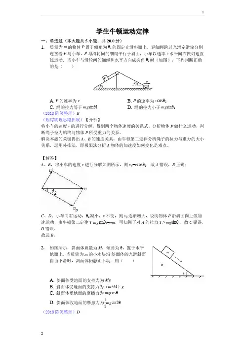 学生牛顿运动定律一、单选题(本大题共5小题,共20.0分)1.质量为m的物体P置于倾角为θ1的固定光滑斜面上,轻细绳跨过光滑定滑轮分别连接着P与小车,P与滑轮间的细绳平行于斜面,小车以速率v水平向右做匀速直线运动.当小车与滑轮间的细绳和水平方向成夹角θ2时(如图),下列判断正确的是()A. P的速率为vB. P的速率为v cosθ2C. 绳的拉力等于mg sinθ1D. 绳的拉力小于mg sinθ1(2018陈笑整理)B(理综物理思路拓展)【分析】将小车的速度v的进行分解,得到两个物体速度的关系式,分析物体P做什么运动,判断绳子拉力始终与物体P所受重力的关系。